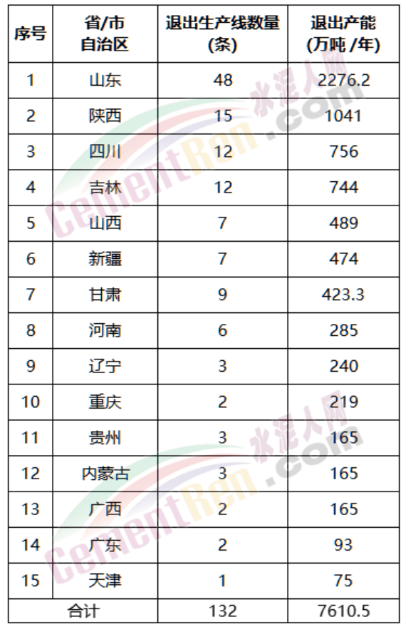 据各地工信厅2022年以来公示公告音讯以及各区域截止2021年末公示产能清单数据,山东、陕西、甘肃、贵州、四川、重庆、天津、山西、内蒙古、新疆、辽宁、吉林、河南、广东、广西等15个省市自治区清晰撤除、拟撤除退出132条熟料生产线万吨/年。