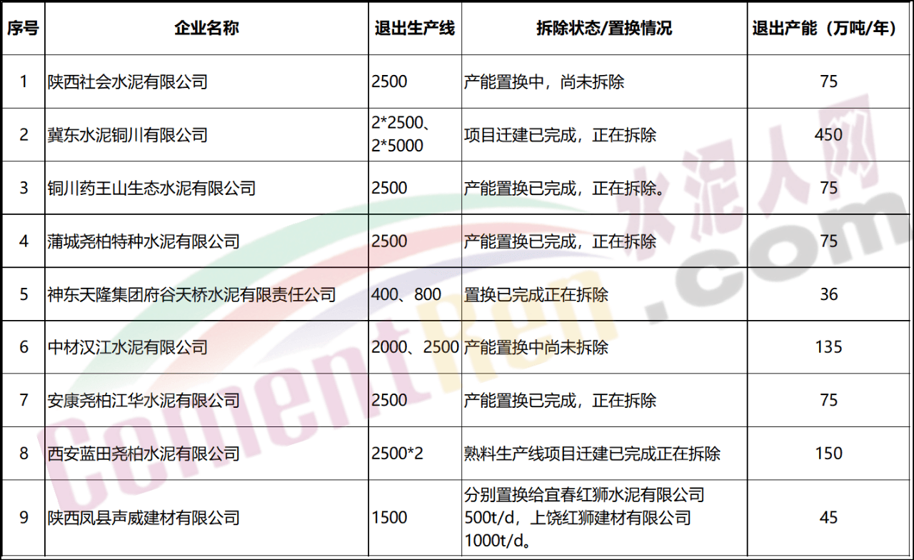 赤峰山水远航水泥有限公司已于2021年3月12日公告将退出一条2000t/d和一条2500t/d熟料生产线t/d水泥熟料生产线退出项目将于新建生产线建成投产前关停并撤除退出。巴彦淖尔中联水泥有限公司