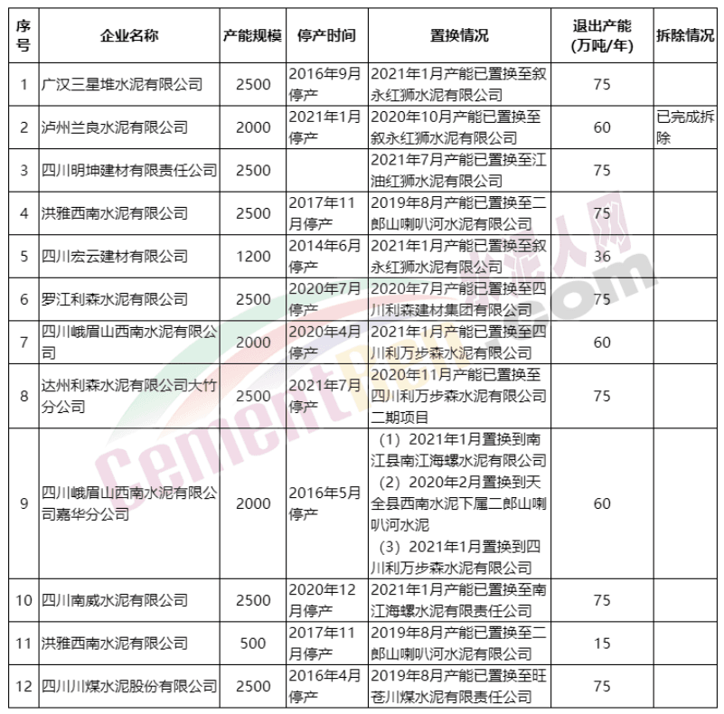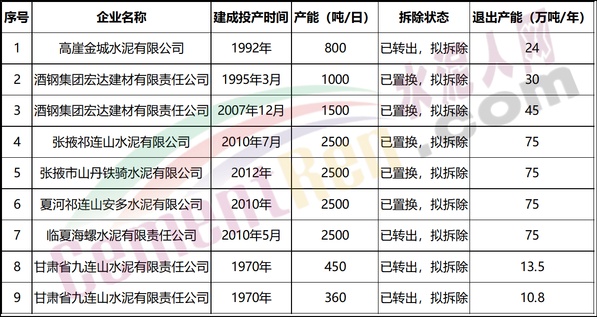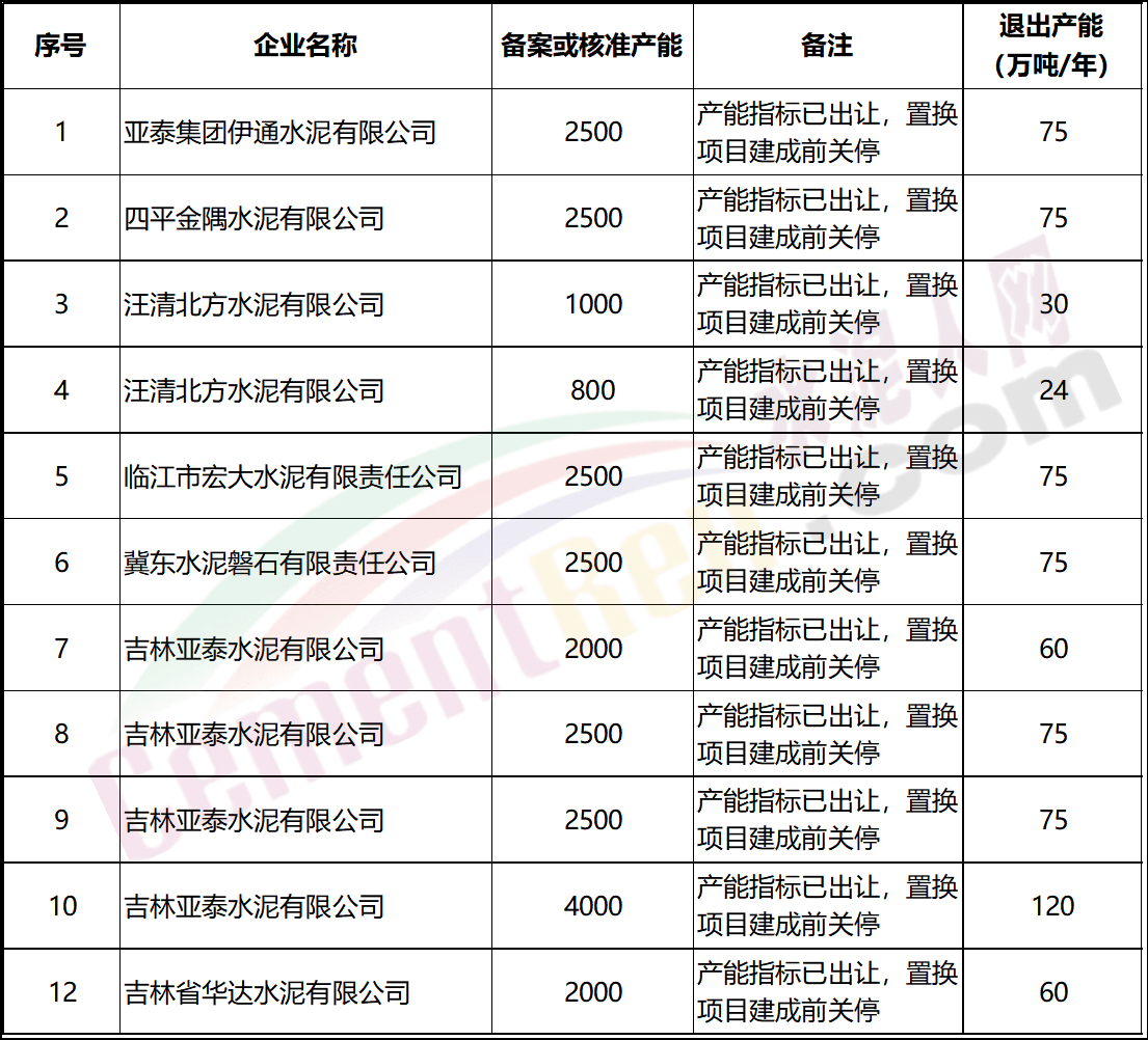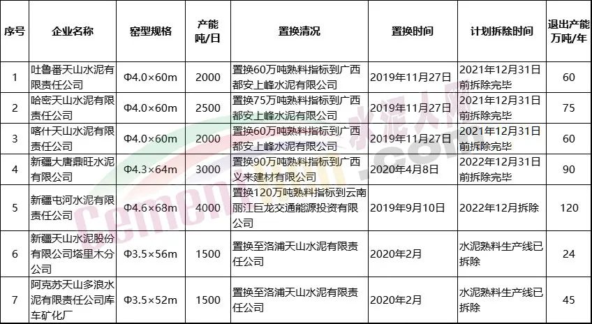 广东梅州皇马水泥有限公司经过置换退出包含新疆新光建材有限责任公司1000t/d、山东鲁碧建材有限公司1000t/d、